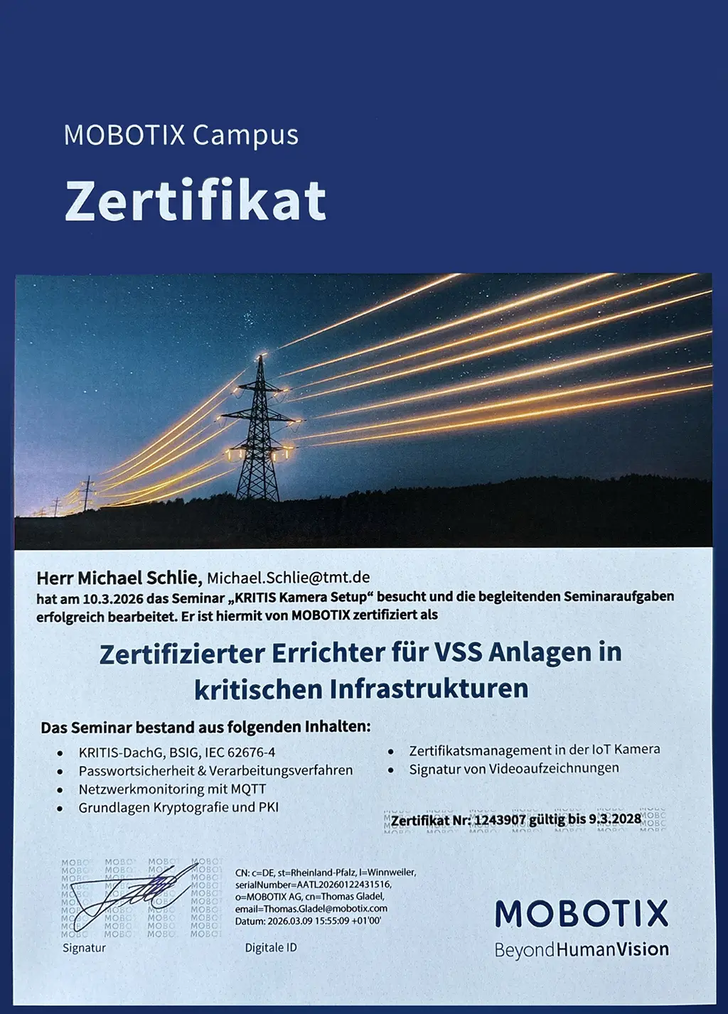 Mit einer aktuellen MOBOTIX-Zertifizierung sind wir als Errichter für VSS-Anlagen in kritischen Infrastrukturen zertifiziert und können entsprechende Lösungen sowohl im NIS2- als auch im KRITIS-Umfeld planen und umsetzen.
